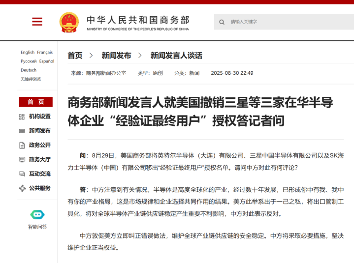 商务部网站消息,商务部新闻发言人就美国撤销三星等三家在华半导体企业“经验证最终用户”授权答记者问。
